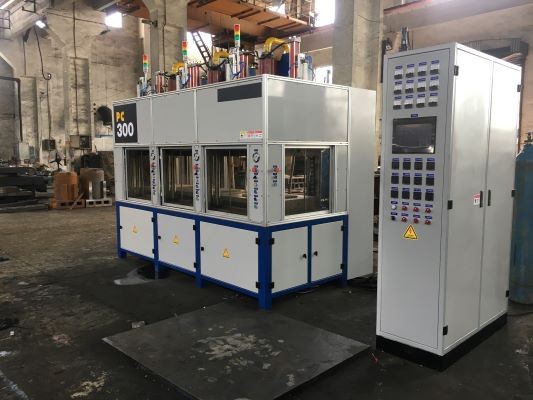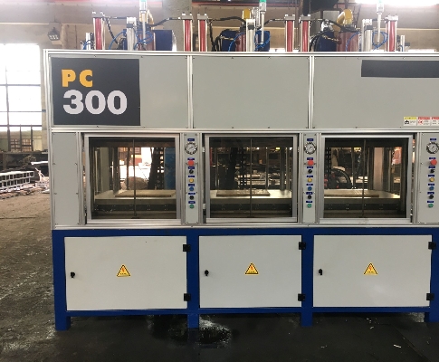 1.主機型式: 四柱式,三缸,三組熱板,自上往下型式,控制柜在機器右側。